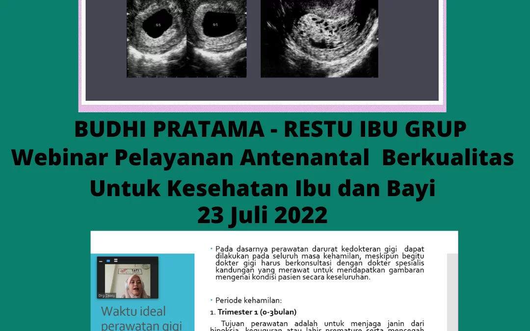 Budhi Pratama Restu Ibu Grup telah menyelenggarakan SERIAL WEBINAR dengan tema “PELAYANAN ANTENANTAL BERKUALITAS UNTUK KESEHATAN IBU DAN BAYI “, yang dilaksanakan pada tanggal 23 Juli 2022 Jam 13.00-16.00 WIB secara LIVE ZOOM BPRI .